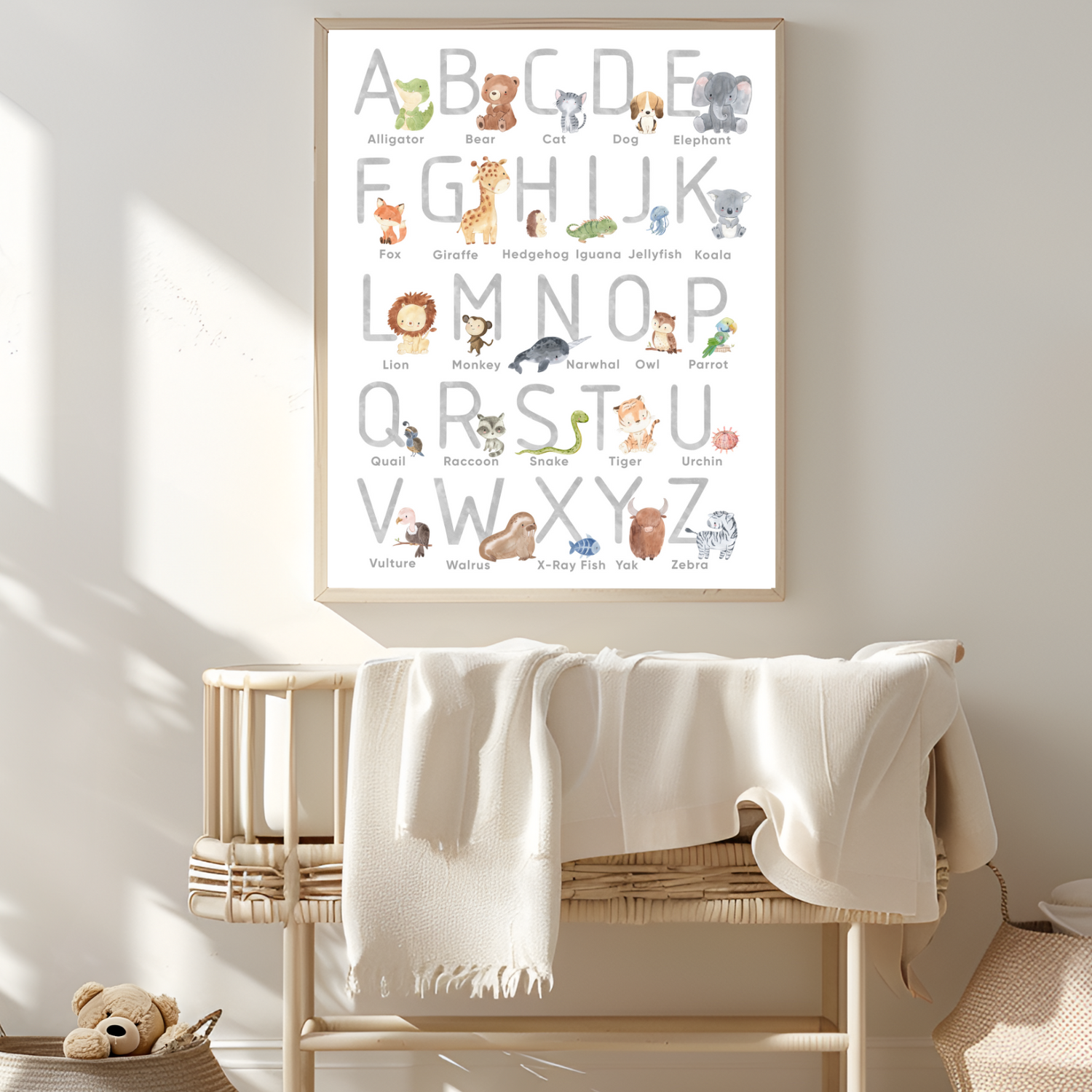 Featuring cute watercolor animals, this 16x20 poster would make a great addition to any nursery, kid's bedroom or playroom