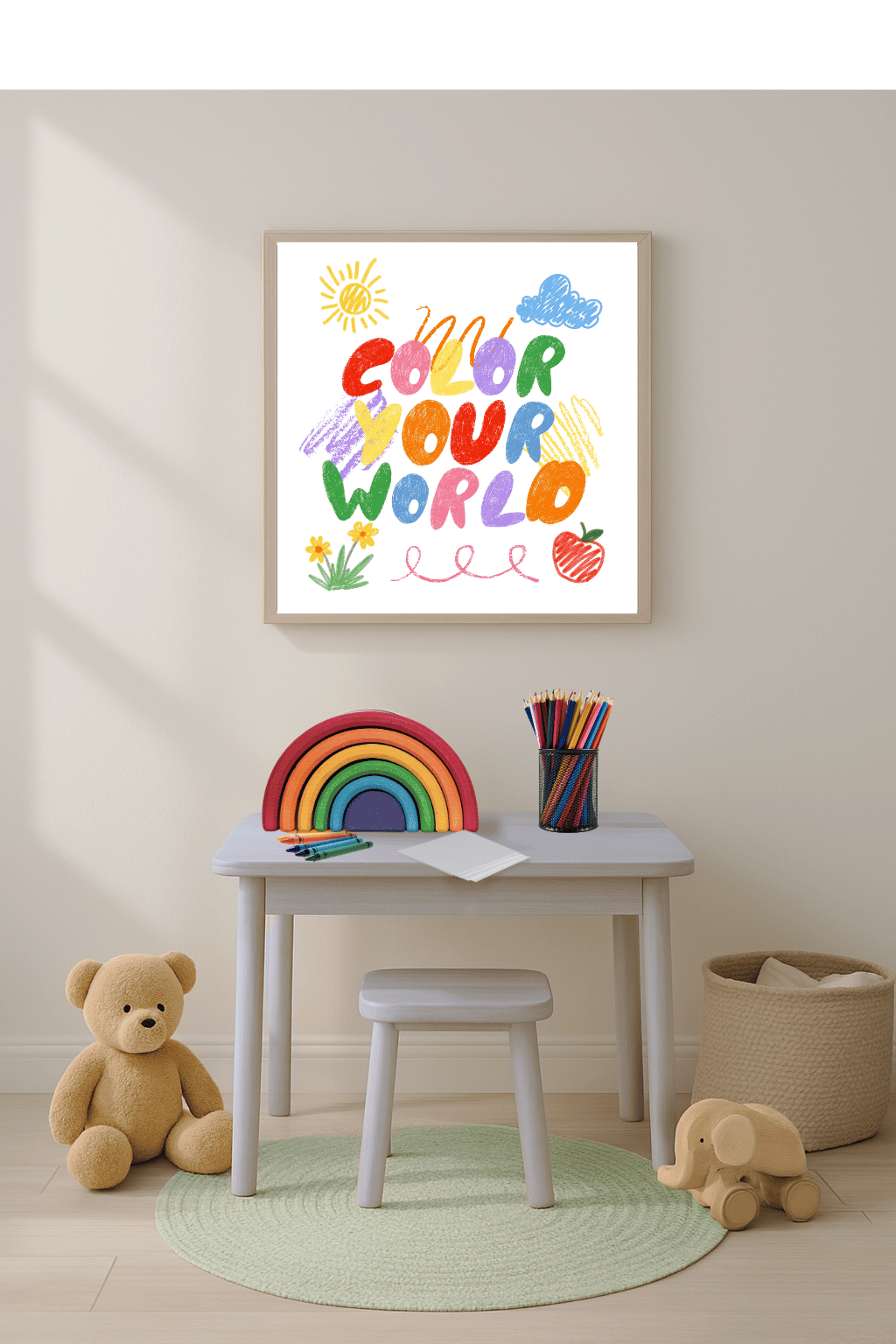 Celebrate creativity and self expression with this vibrant print featuring playful crayon-like artwork in bold, saturated hues, this piece brings warmth and imagination to any space. Perfect for studios, children's rooms, or creative workspaces, it serves as a daily reminder to embrace artistic freedom and individuality.