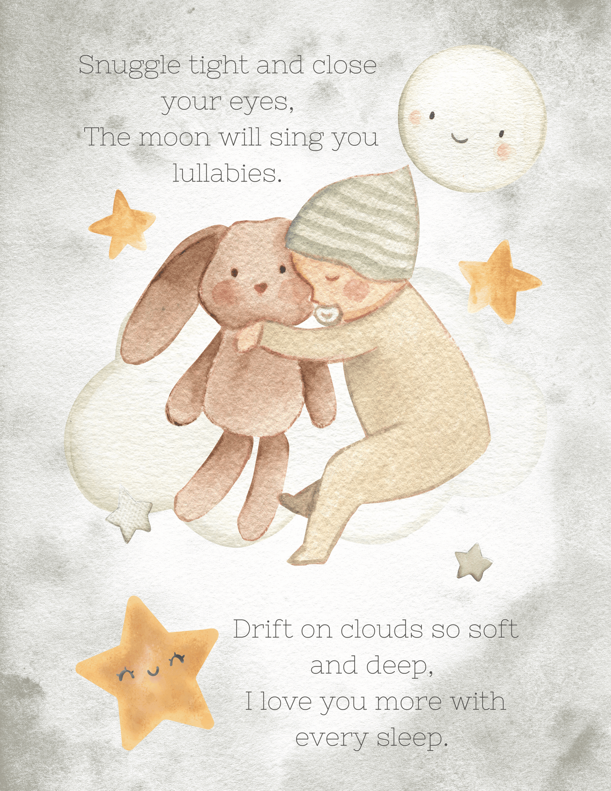 A tender illustration capturing the peaceful innocence of slumber. This charming print features a lullaby-inspired poem that evokes warmth and comfort, making it an ideal addition to nurseries and children's rooms. The gentle imagery and soothing verse create a calming atmosphere perfect for bedtime routines or as a meaningful gift for new parents seeking to infuse their space with quiet joy and tenderness.